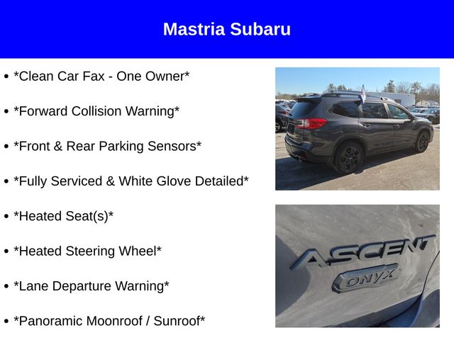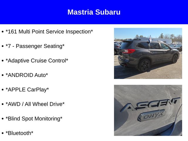 Experience the ultimate in family-focused versatility, safety, and performance with the 2023 Subaru Ascent Onyx Edition Subaru Certified. Visit our showroom today and let us demonstrate how this exceptional SUV can enhance your daily adventures and create lasting memories with your loved ones.