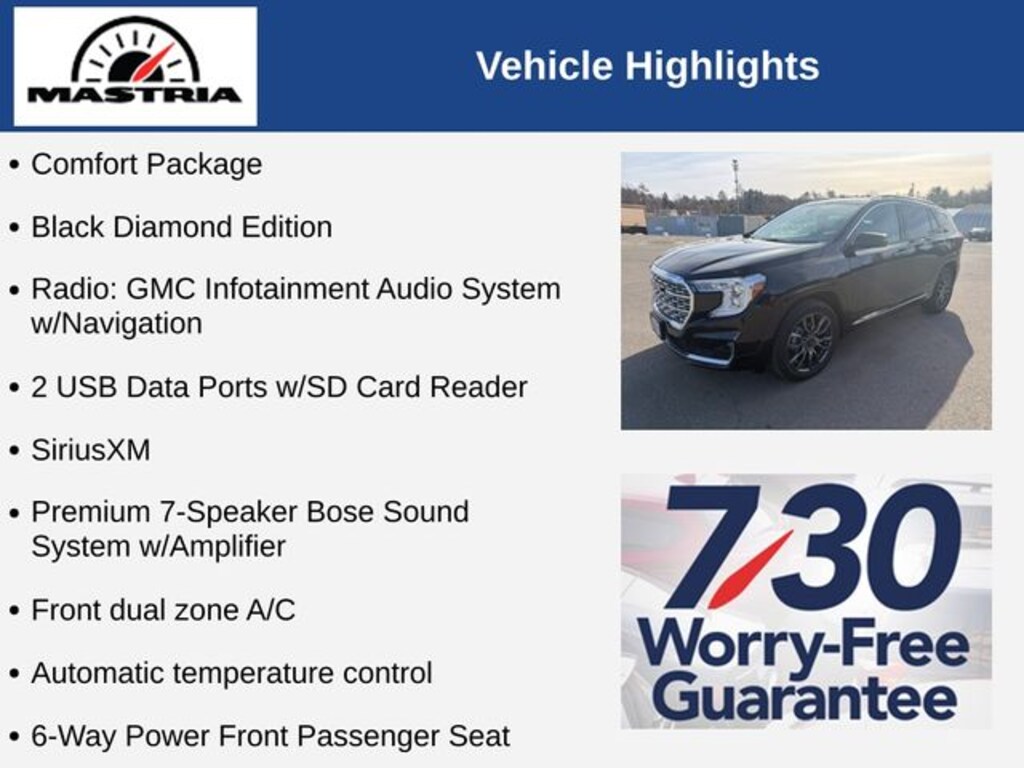 This Black Diamond Edition Terrain Denali also features the Comfort Package, Denali Premium Package, and Tech Package, ensuring an unparalleled level of sophistication and convenience. Indulge in the premium 7-speaker Bose sound system, wireless Apple CarPlay and Android Auto, and the advanced navigation system that will guide you effortlessly to your destination.