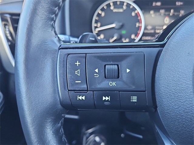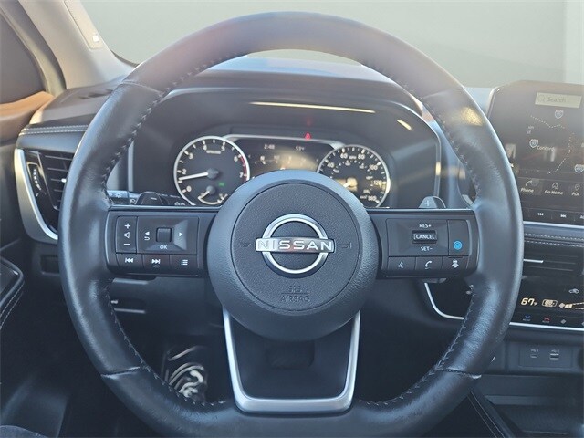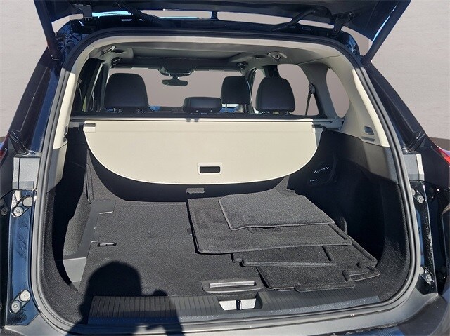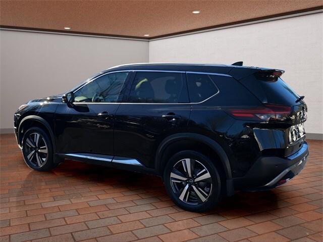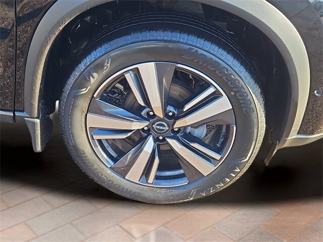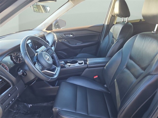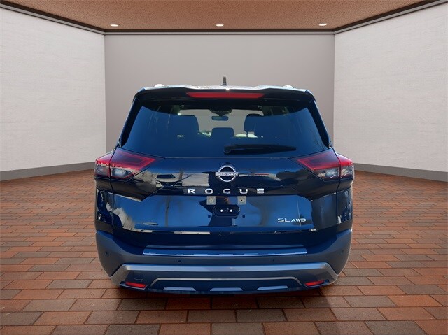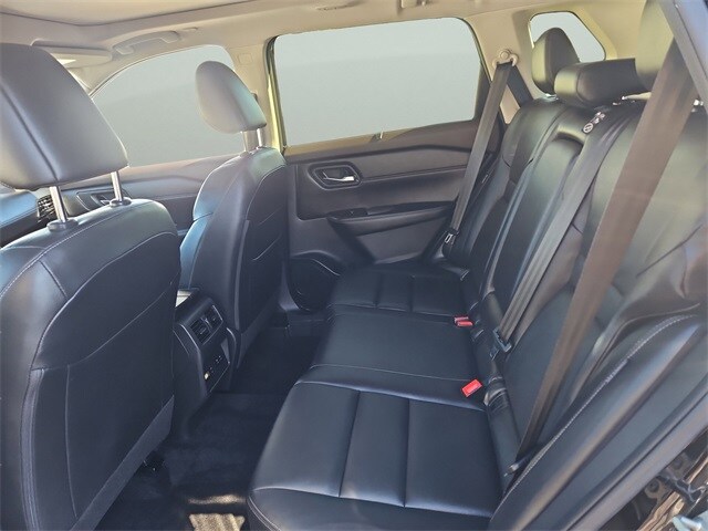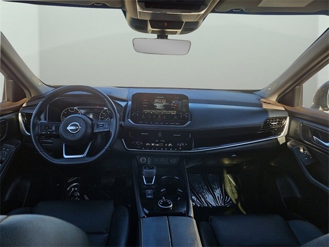 The SL trim stands out with leather-appointed seats, heated front seats, heated leather-wrapped steering wheel, driver memory settings, dual-zone automatic temperature control, remote engine start with Intelligent Climate Control, power liftgate and panoramic moonroof. The 19-inch alloy wheels, LED headlights with signature daytime running lights, LED fog lights, roof rails and rear privacy glass give this Rogue a refined, upscale presence.