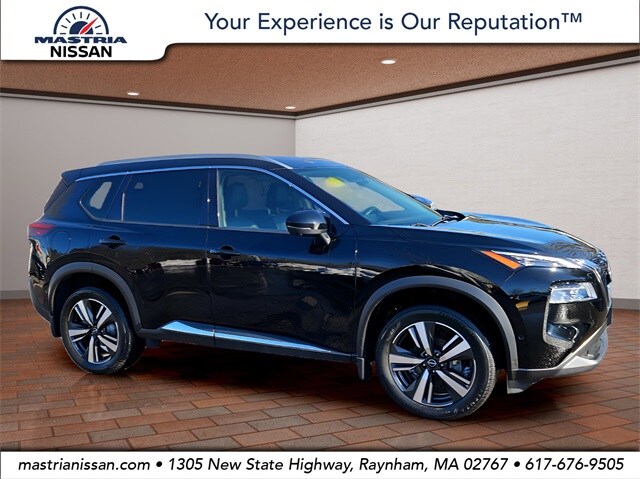 2023 Nissan Rogue SL AWD in Super Black with Charcoal interior, available now at Mastria Nissan, a top rated dealer in Raynham MA.