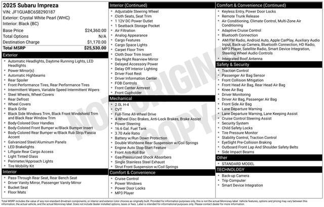 Whether you're looking for a reliable daily driver or a versatile companion for your active lifestyle, the 2025 Subaru Impreza Base is a compelling choice. Experience the exceptional craftsmanship, advanced technology, and dynamic performance that make this Impreza a standout in its class. Visit our showroom today and let us demonstrate why the Impreza should be your next vehicle.